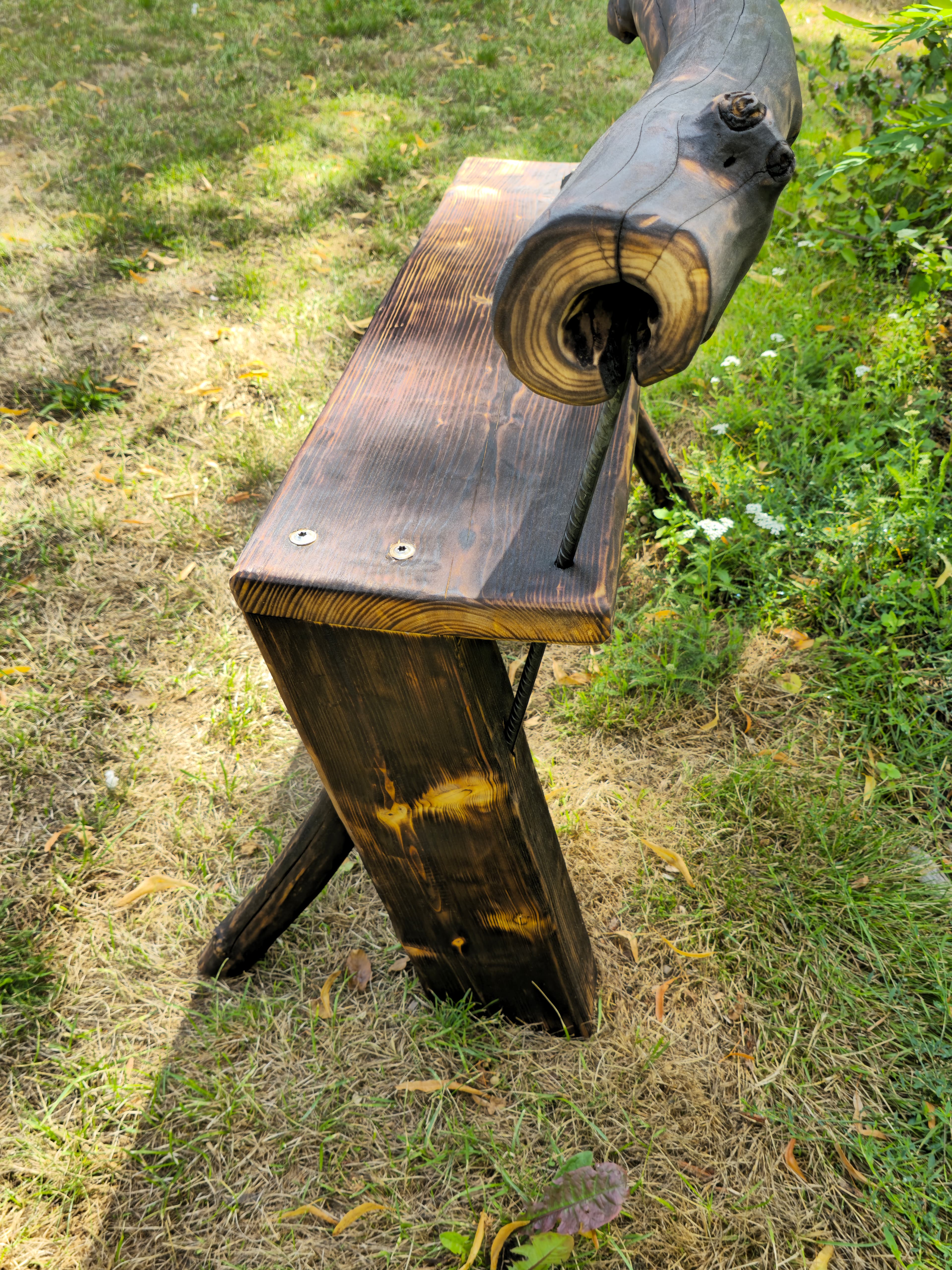 Die Oberfläche wurde geölt, wodurch die natürliche Maserung besonders schön zur Geltung kommt und das Holz gleichzeitig geschützt ist. Die Bank ist ein echtes Unikat – dieses Exemplar ist ein Einzelstück.