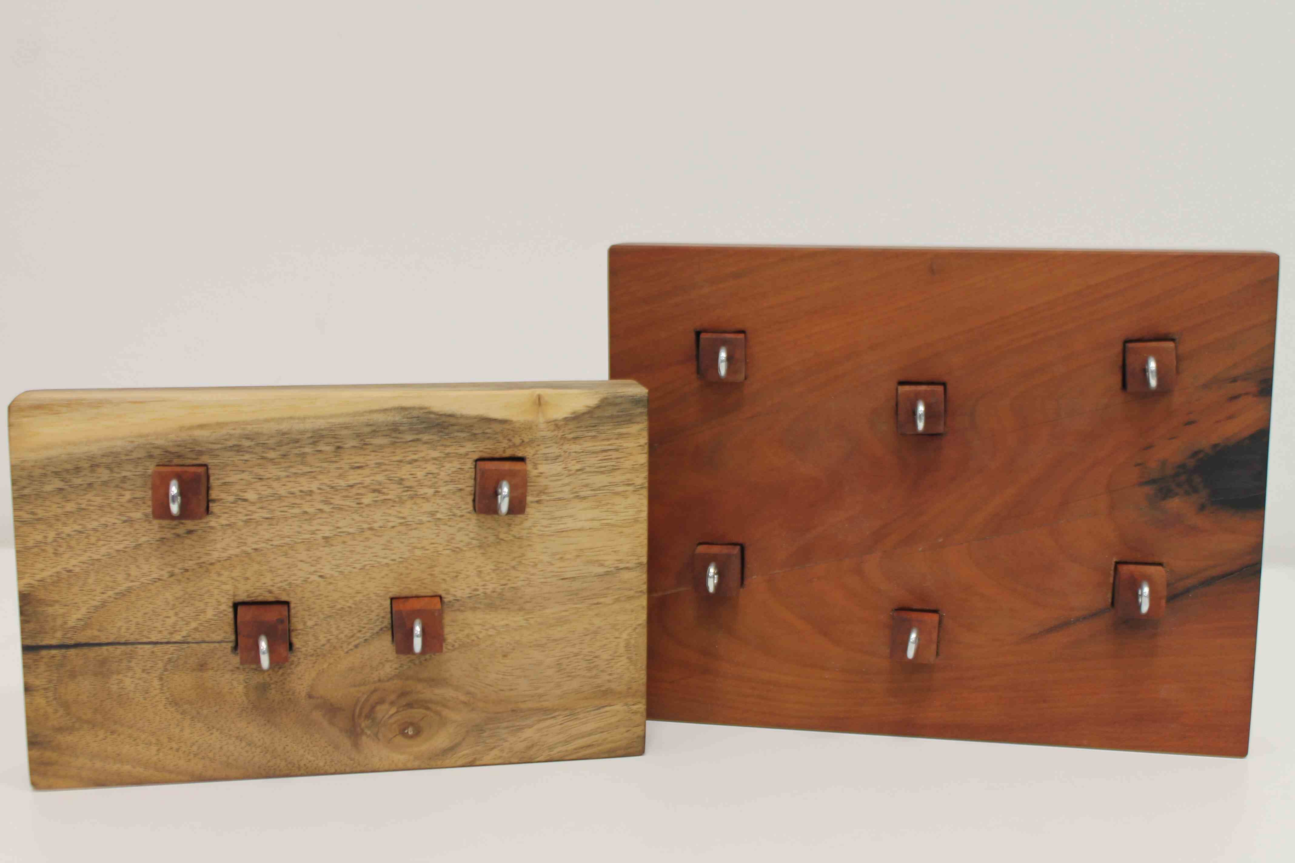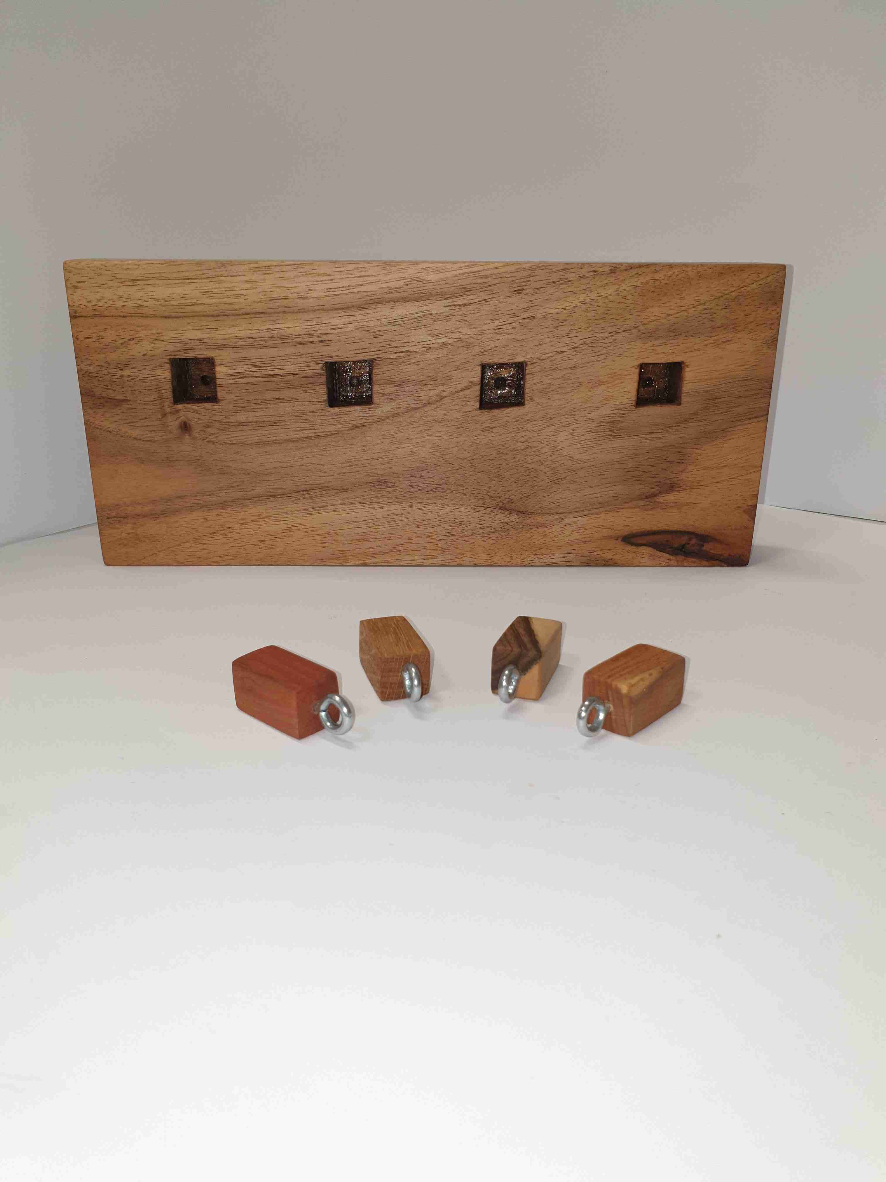 Wir fertigen Ihnen Schlüsselbretter aus einer Auswahl an uns gespendeter Holzarten, wie Walnuss, Eiche, Fichte, Birne und Zwetschke, mit einer beliebigen Anzahl an austauschbaren, integrierten Schlüsselanhängern: Holzbits an Ösen, die mit den Schlüsseln in das Brett gesteckt werden können.